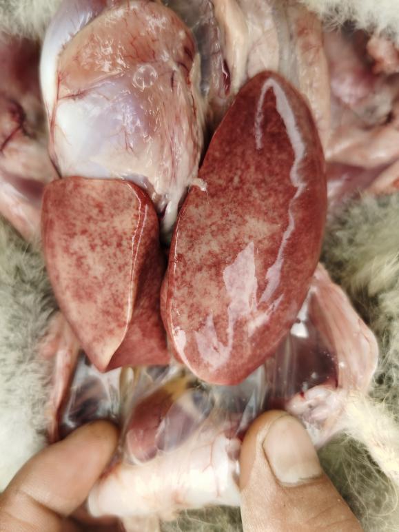 结果回访:通过换料和用药1天后回访,第二天伤亡明显下降(用药后死亡4只),随后3天药使用完后仅伤亡了3只,肝脏出血硬化症状消失,大群精神状态活泼、采食量明显上升。