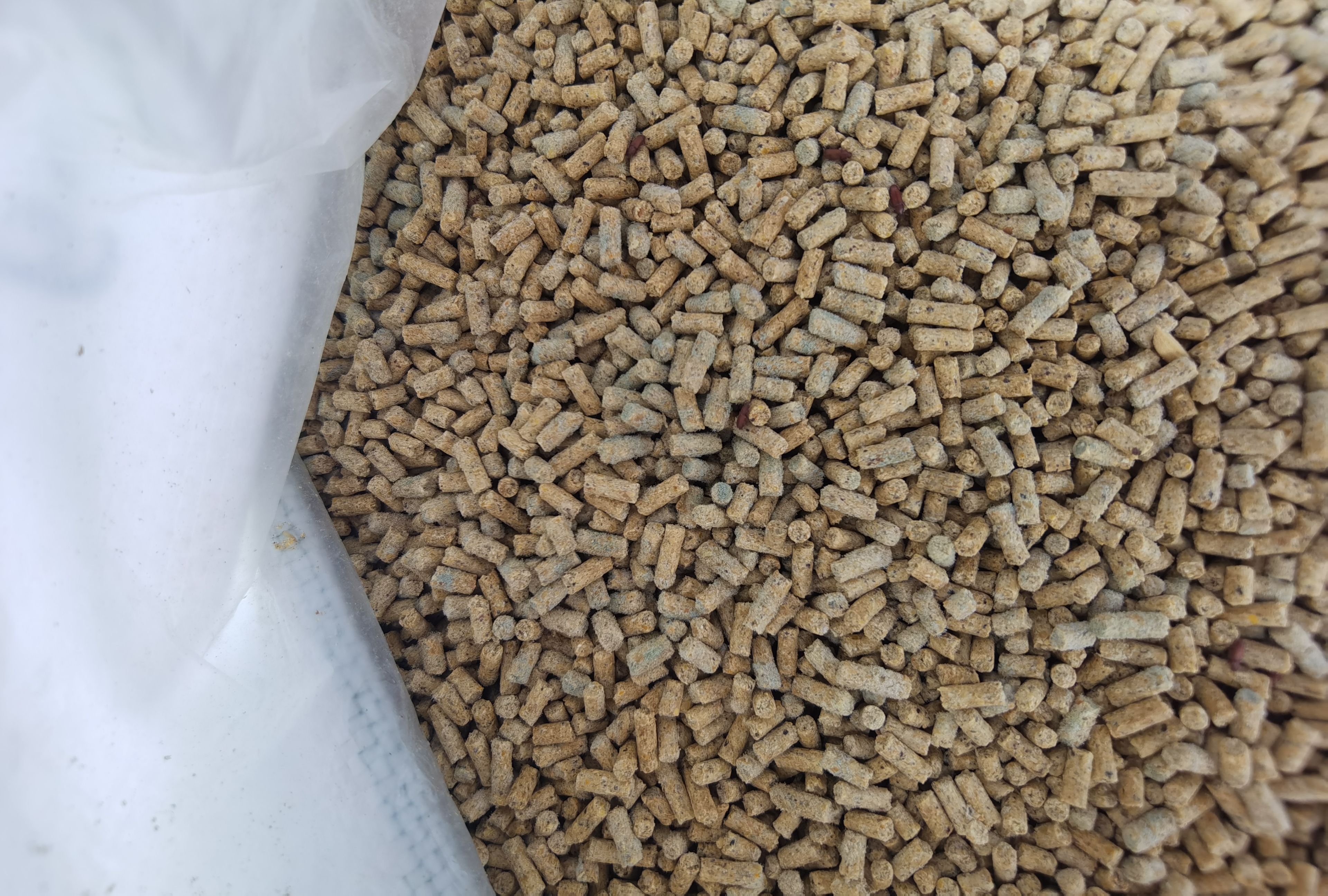 随后检查了场地各个地方,水源以及饲料等,果然在饲料桶中发现了明显结块发霉的饲料。经询问是因为饲料在卸车时恰逢下雨导致饲料淋雨了,过后又没有采取紧急干燥处理和单独保管措施,导致近三天使用的饲料中存在严重的霉变情况,因为高温天气的原因,特别是昨天的饲料霉变情况更加严重。